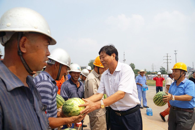 8月3日上午,新安縣產(chǎn)業(yè)集聚區管委會(huì )副主任牛志偉一行帶著(zhù)西瓜、礦泉水等防暑降溫物品,到萬(wàn)基控股集團2×60萬(wàn)千瓦機組工程建設工地慰問(wèn)施工人員??偨?jīng)理郭峰陪同。