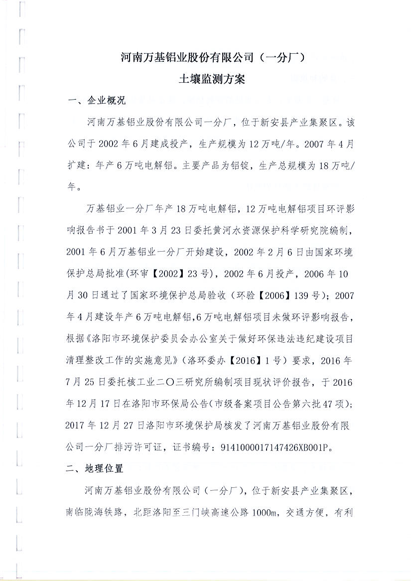 河南萬(wàn)基鋁業(yè)股份有限公司(一分廠(chǎng))2019土壤自行檢測方案